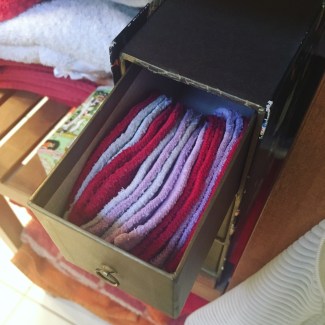 Nach Gebrauch kommen sie in ein Wäschesackerl und werden mit der Wäsche mitgewaschen, dann lass ich sie trocknen, fertig. Man muss nur darauf achten, dass das verwendete Garn nicht recht haarig ist, denn das ist unangenehm beim Abschminken.